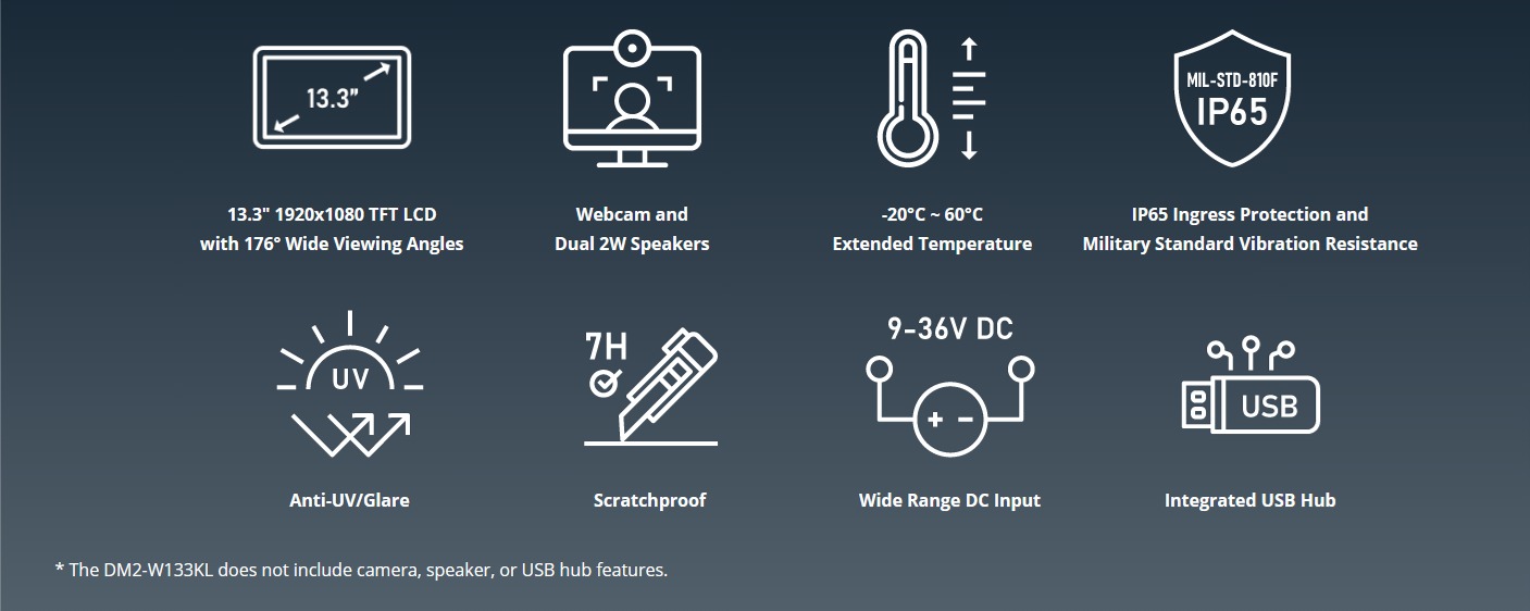 | DM2-W133KL-R10 | 13.3″ 350 cd/m² 1920 x 1080 monitor, VGA, HDMI, DisplayPort, USB PC touch screen, 9 ~36V DC input, Lite, R10 |