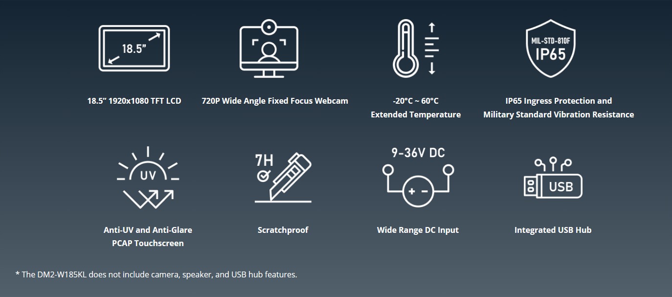 | DM2-W185K-R10 | 18.5″ 350 cd/m² 1920 x 1080 monitor, VGA, HDMI, DisplayPort, with USB 3.0 HUB, USB PC touch screen, 9 ~36V DC input, Speaker, Camera, R10 |
