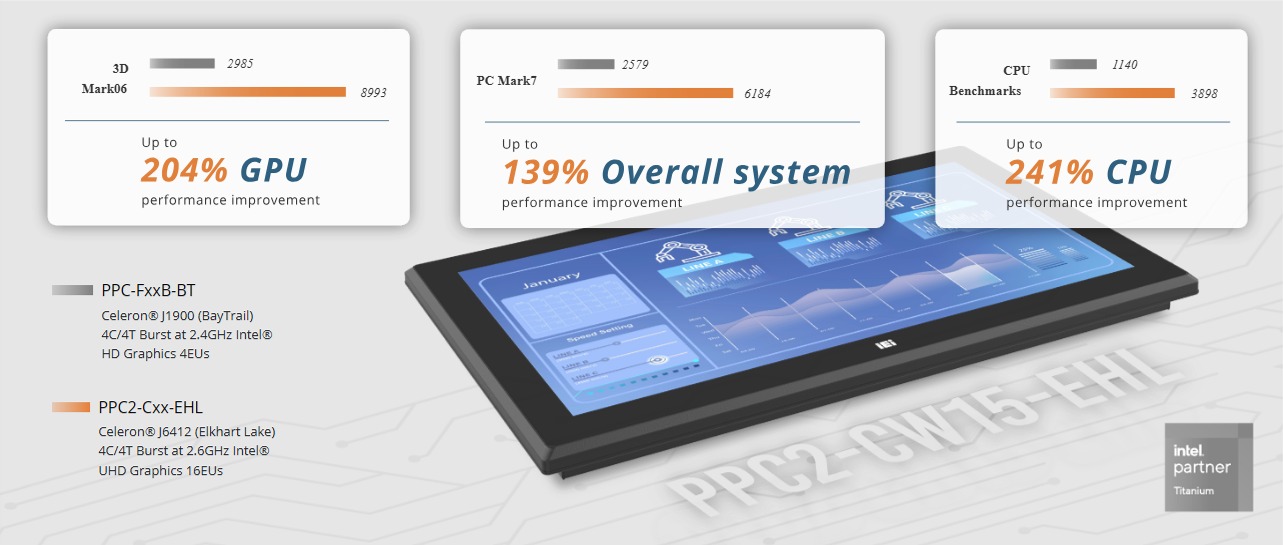 Powered by Intel® Celeron® J6412 processor (burst up to 2.6 GHz), the PPC2-CW15-EHL can deliver high levels of CPU and graphics performance at low power. Compared to the previous generation (PPC-F-BT), the PPC2-CW15-EHL offers 204% and 139% boost on for graphics and overall system performance, making it perfect for multitasking. With the feature of low power and excellent throughput, the 15.6” industrial panel PC can benefit IIoT edge computing by saving lots of energy while maintaining high computation.